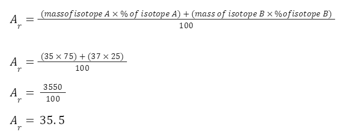 A sample of chlorine gas is a mixture of 2 isotopes, chlorine-35 and chlorine-37. These isotopes occur in specific proportions in the sample i.e. 75% chlorine-35 and 25% chlorine-37. Calculate the relative atomic mass of chlorine in the sample.