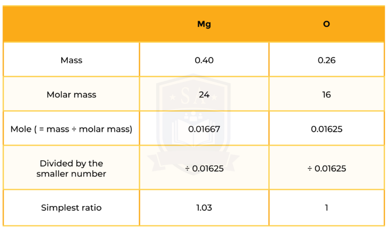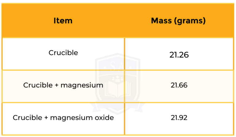 Mass of O = mass (crucible + magnesium oxide) – mass (crucible + magnesium)