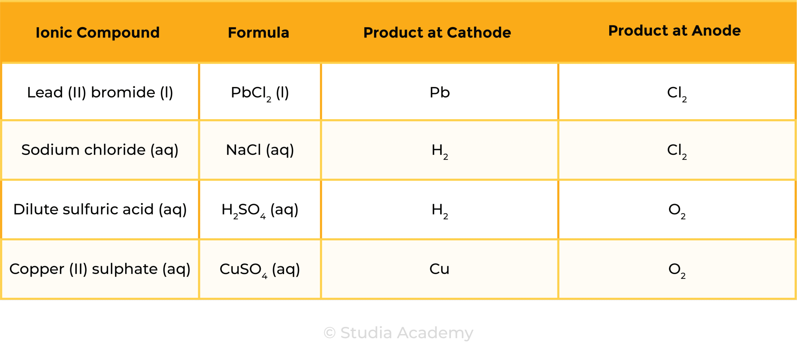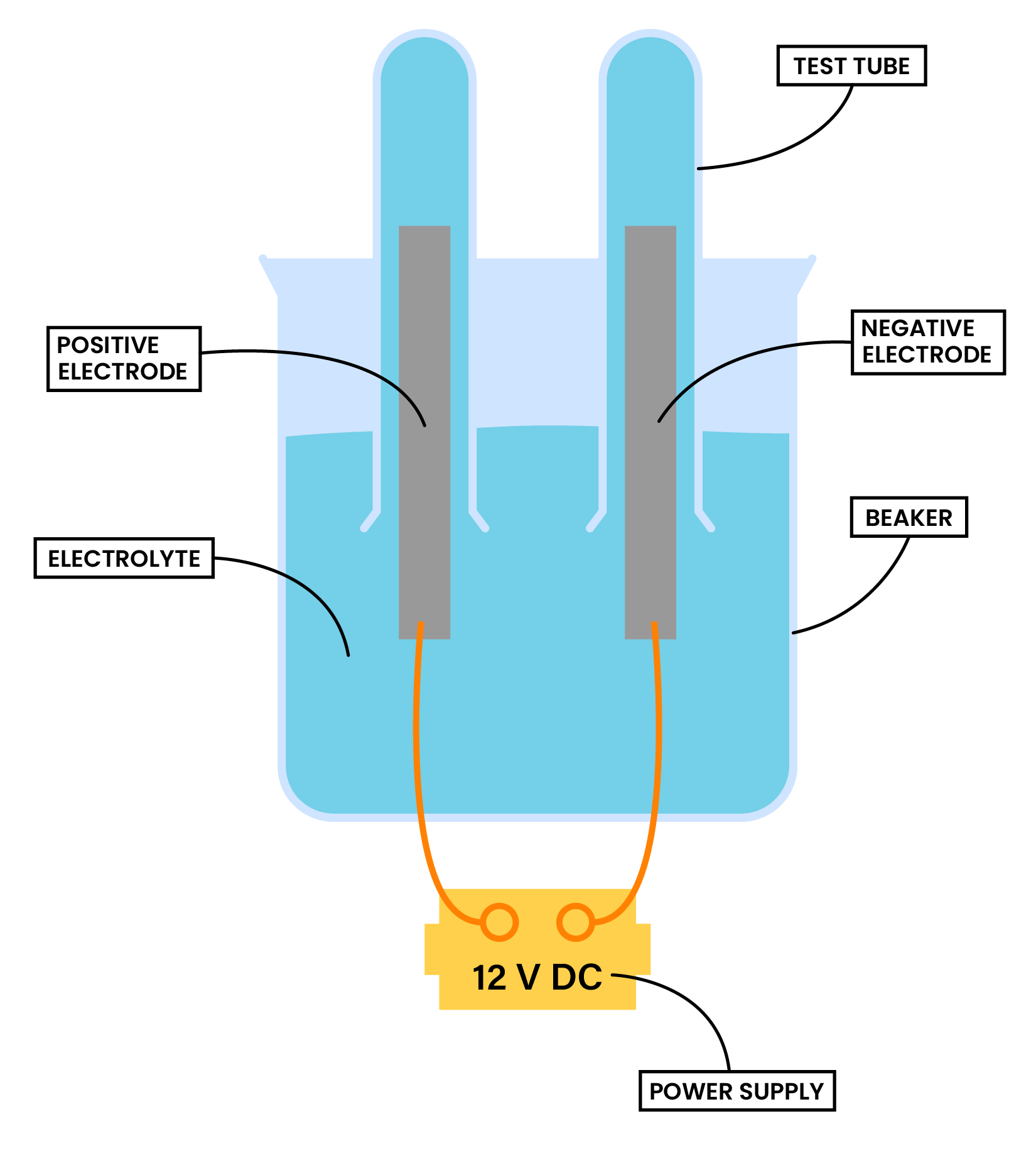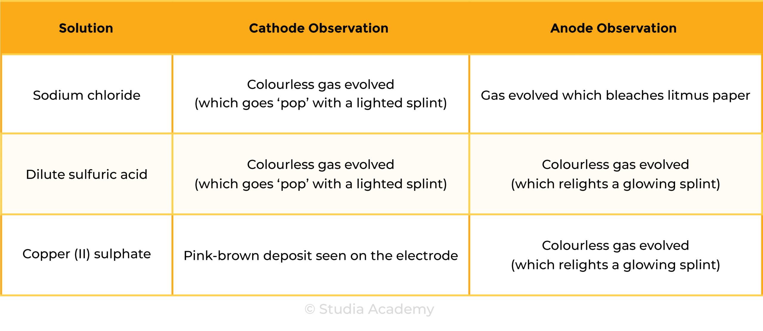 To electrolyse aqueous solutions of sodium chloride, sulfuric acid and copper(II) sulphate, and to collect and identify the products at each electrode