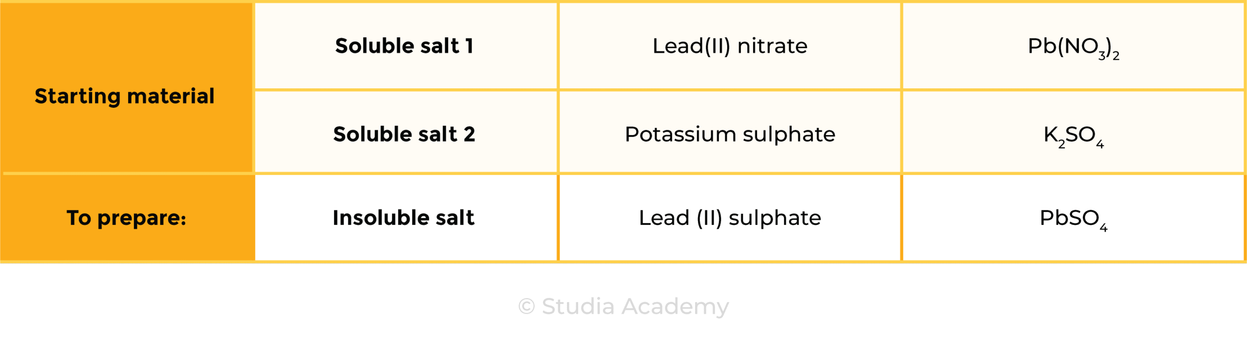 Soluble Salt 1 + Soluble Salt 2 ⟶ Insoluble Salt + Soluble Salt 3