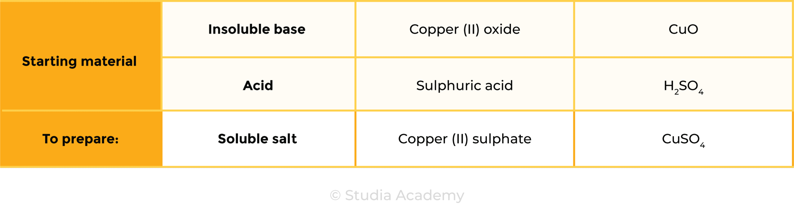 copper (II) oxide + sulphuric acid → copper (II) sulphate + water